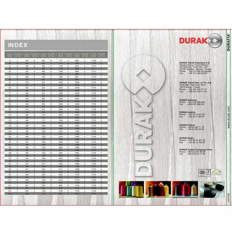 DURAK Durafix es un fuerte hilo de poliéster de filamento continuo 100% adecuado para muchos tipos de operaciones de costura. Está disponible desde Tex 450 a 7 en 19 tamaños de hilo diferentes con 100 colores (consúltanos). Este hilo tiene una lubricación especial, una enorme resistencia y, debido a su estructura uniforme, proporciona excelentes costuras que dan una apariencia de color especial en la superficie lisa de la tela. También se puede procesar para tener propiedades técnicas especiales como WR, UV, AS, etc. Garantiza costuras perfectas en todo tipo de superficies.