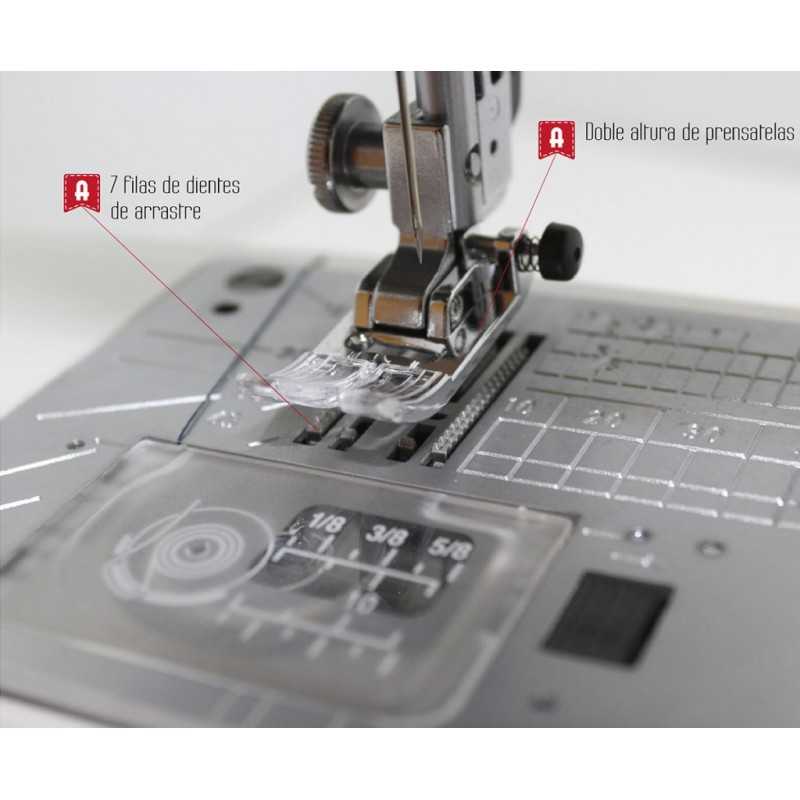 - Doble altura de prensatelas para géneros gruesos.