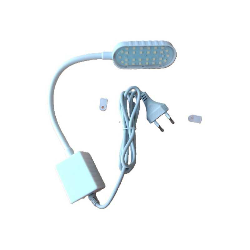 Lámpara sewmaq de 20 LEDs con soporte magnético y brazo articulado de acero para ajustarla a la parte de la máquina que se quiera iluminar.