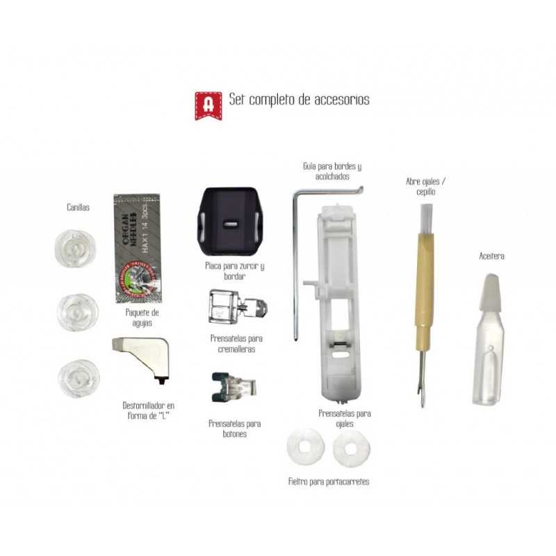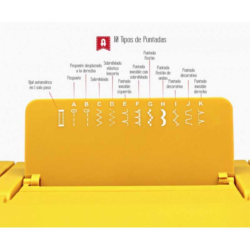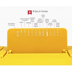 · 12 puntadas para todo tipo de trabajos: Ojal automático en 1 paso, Básicas, Decorativas, Festones, Zig-zag.